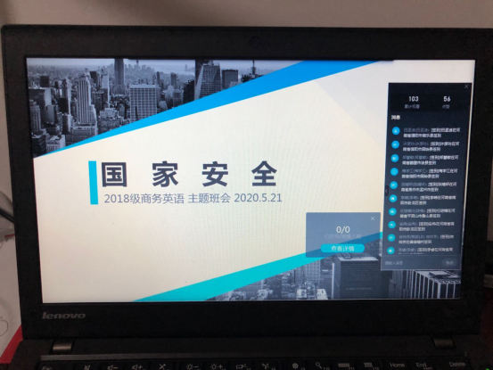 5月21日晚,商英18级全体员工在辅导员的带领下,使用钉钉直播的方式,在线开展了“国家安全”主题班会。