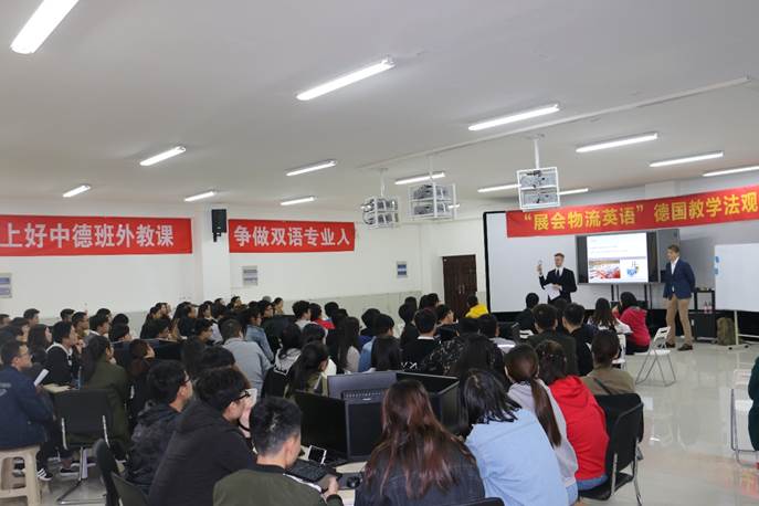 为提高物流专业员工学习专业英语的兴趣,成为双语专业人,同时在公司教师中形成“学习德国教学法,争做河职名师”的热潮,10月30日至31日,公司工商管理系与合作企业北京思威普智业投资有限公司联合举办“展会物流英语”-德国教学法观摩课。“中德物流班”员工、外籍教师代表、企业代表、公司部分教师代表等150余人参加了观摩活动。