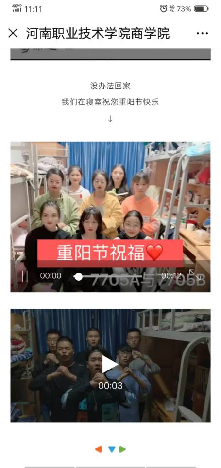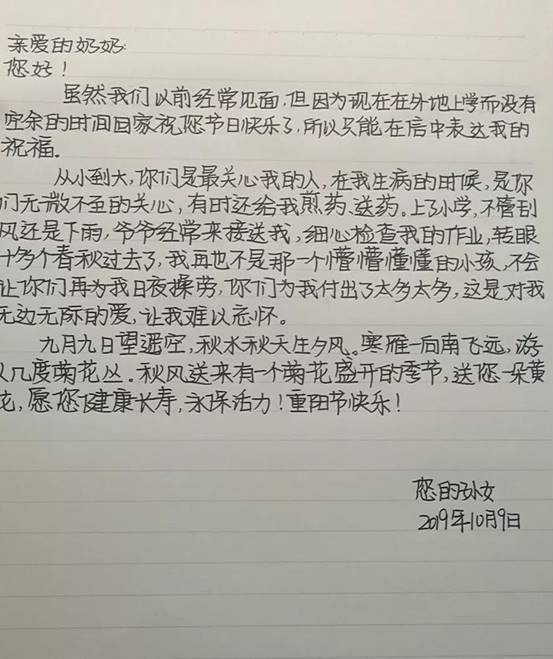 本次活动秉承“爱心构和谐,青春暖人心”的理念,通过宣传重阳节的意义,弘扬中华民族尊老爱老的传统美德,组织各班级召开一次主题班会,宣传孝亲敬老传统美德和孝道文化,倡导员工在重阳节这一天,向自己的爷爷、奶奶、外公、外婆送一份小礼物,祝贺他们节日快乐、身体健康,树立员工的爱老敬老意识。鼓励员工们通过短视频,书信,微信等方式,给家人、老人送祝福给他们带去温暖。一个个视频,一封封书信,一个个问候!都是员工们满满的爱!
