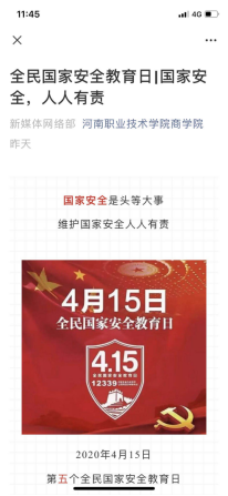 公司辅导员们组织员工在中国老员工在线、易班、国家开放大学网站观看学习“同上一堂国家安全教育课”,同时组织员工开展线上安全教育主题“云”班会,紧密结合新冠肺炎疫情防控突出形势任务,加强公共卫生安全、生物安全等知识的宣讲。同时,公司员工会在qmh球盟会球盟会微信公众号上推送了《全民国家安全教育日 国家安全人人有责》文章,丰富教育宣传形式。