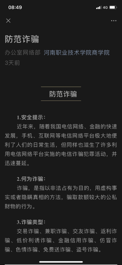 我们组织“预防电信诈骗”主题班会,动员全院师生关注“国家反诈中心”官方政务号,推广下载郑东分局反诈中心“金钟罩”小程序。转发《防范电信网络诈骗宣传手册》,积极在微信球盟会公众号、朋友圈、微信群组等平台转发反诈宣传视频,扩大宣传覆盖面,在网站推出宣传报道资料。