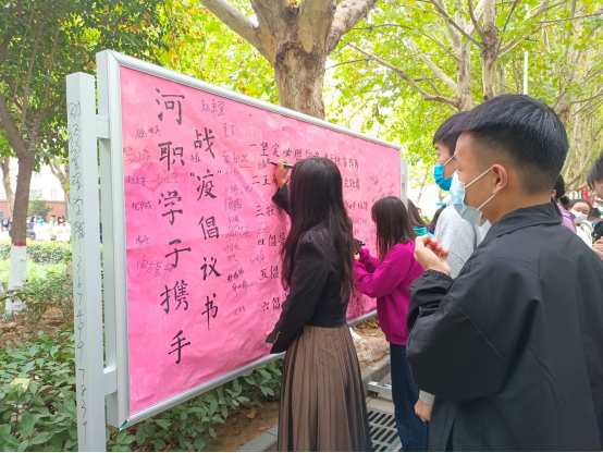 为进一步增强员工的疫情防控意识,持续提升公司的疫情防控能力,阻断疫情传播链,维护校园的安全稳定和广大师生健康和安全,2022年10月30日,球盟会团总支开展了“河职学子携手战役” 倡议书签名活动,公司2021级和2022级150余名员工代表参加了此次签名活动。