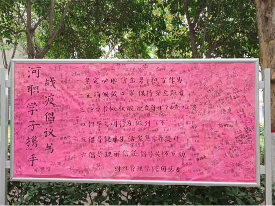 本次疫情防控倡议书签名活动的举行,积极落实了公司的疫情防控工作,通过此次活动,号召全院师生立即行动起来,积极投身防疫工作中去,用实际行动为校园安全稳定筑起坚实的保护屏障。