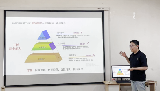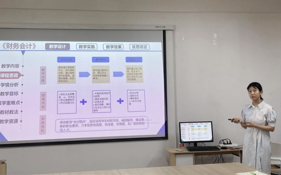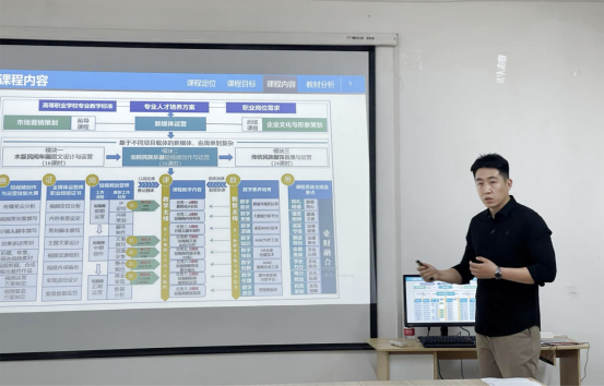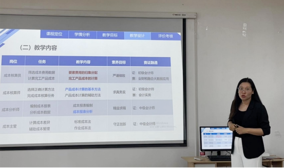 在专业教师说课程环节,李嘉晖、武萌等五位教师分别讲说了《新媒体运营》《纳税实务》《审计理论与实务》《财务会计》《成本核算与管理》五门课程,包括课程定位、教学资源、课程内容、教学实施、课程特色、课程反思等。四位点评专家对公司教师教学水平和教学质量给予积极评价,并从教材选取、教法手段、激发员工学习兴趣、员工学法、教学过程、教学反思、特色创新、板书设计、借鉴教学能力大赛经验等提出指导意见。